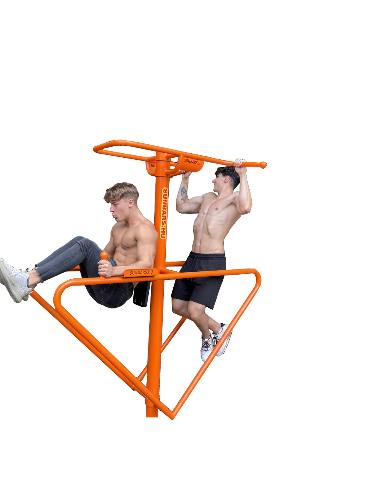 Az alsó résszel (tolódzkodó) a kar, és mellizmok erősítését végezhetjük, a felső rész (húzódzkodó) pedig a hát, váll, és karizmok erősítésére szolgál. Előnyös, hiszen azzal, hogy egy állványon van mindkét eszköz, intenzívebbé tudjuk tenni az edzésünket, könnyebben kombinálhatóak a gyakorlatok. Húzódzkodás során a kifelé fordított tenyérrel történő madárfogás (a rúd a hüvelykujj és a mutatóujjak közé esik) alkalmazásával a hátizmok, a szűk vállszélességű fogás (befele fordított tenyér) esetén pedig főként a bicepszet tudjuk edzeni. Az edzőkeret lehetőséget ad a felhasználónak, hogy szűk vagy széles fogást válasszon a húzódzkodó gyakorlatokhoz, ezek a hát különböző izomcsoportjait erősítik, formálják. A húzódzkodás szűk fogással a hátizom alsó-külső részét stimulálja leginkább, a fogás és végrehajtás módjától függően a bicepsz is jelentős terhelést kaphat, míg a széles fogás főképpen a széles hátizmot fejleszti. A tolódzkodás során attól függően, hogy könyökünket a testünk mellett vagy a testünktől eltolva végezzük a gyakorlatot a mell, tricepsz izmokat tudjuk dolgoztatni. Az állvány alsó részén lévő fellépők segítik a sportolók kiinduló helyzetbe kerülését, illetve a kezdőknek segítséget nyújthat a gyakorlatok elvégzésében is. A hasizmok valamint a törzsizmok erősítését szolgáló gyakorlatok végzésére használható, miközben erősíti a hátgerincet is, ezáltal javítja a testtartást is. A gép felülete csúszásmentesített, a balesetek elkerülése érdekében. A tolódzkodó és hasizom részen lévő fellépők segítségével mindenki kényelmesen, tudásának megfelelően tudja használni a szert. Az edzőgép masszív vázszerkezete megakadályozza a billegést a gyakorlatok elvégzése közben.Minden korosztálynak remek szórakozást és sportélményt nyújt a szabadban a Sunbars kültéri fitneszgép család. Iskolák udvarára, kollégiumokba, szállodákba, strandra, parkokba vagy sportpályák mellé javasoljuk.A tolódzkodó rész használata:Kezdőknek: Álljon szembe a tolódzkodóval, fogja meg a 2 hajlított csövet, lépjen fel a fellépőre, úgy hogy karjai ki legyenek nyújtva, ebből a testhelyzetből engedje le magát, amíg csak tudja, majd tolja ki magát a kiinduló helyzetbe.. Ebben a helyzetben végezzen folyamatos karhajlításokat. Ha a mellizmokat akarjuk alaposabban dolgoztatni kifele toljuk a könyökünket, ha a tricepsz izmokat akarjuk intenzívebb munkára bírni akkor a test mellett tartva végezzük a gyakorlatot.Haladóknak: Álljon szembe a tolódzkodóval, fogja meg a 2 hajlított csövet, tolja ki magát. Ebben a testhelyzetben végezzen folyamatos karhajlításokat.Húzódzkodó rész javasolt használata: Kezdőknek és gyerekeknek: Kérjen segítséget társától, fogja meg a rudat tartsa magát áll magasságban, mikor társa elengedte lassan engedje le magát, könyöke nyújtásával, majd húzza vissza magát a kiinduló helyzetbe.Haladóknak: Álljon szembe az oszloppal és húzza fel magát a hajlított csövön. Ebben a helyzetben végezzen folyamatos felhúzásokat. A karok közötti távolság, fogásmód változtatható. Alkalmas különböző húzódzkodó, illetve nyújtó gyakorlatok végzésére is.Hasizom-erősítő rész javasolt használata:Álljon háttal az állványnak, hátát támassza a háttámlának, fogja meg a kapaszkodókat. A lábemelést végezheti: – nyújtott lábbal, derékszögig, – térdfelhúzással, – térdfelhúzással oldalra (oldalsó hasizmok erősítésére), – a gyakorlatok kombinálásávalMegjegyzés: • Az eszköz intenzív igénybevétele fokozott felülvizsgálatot és ápolást igényel. • A berendezés nem rejt veszélyeket magában