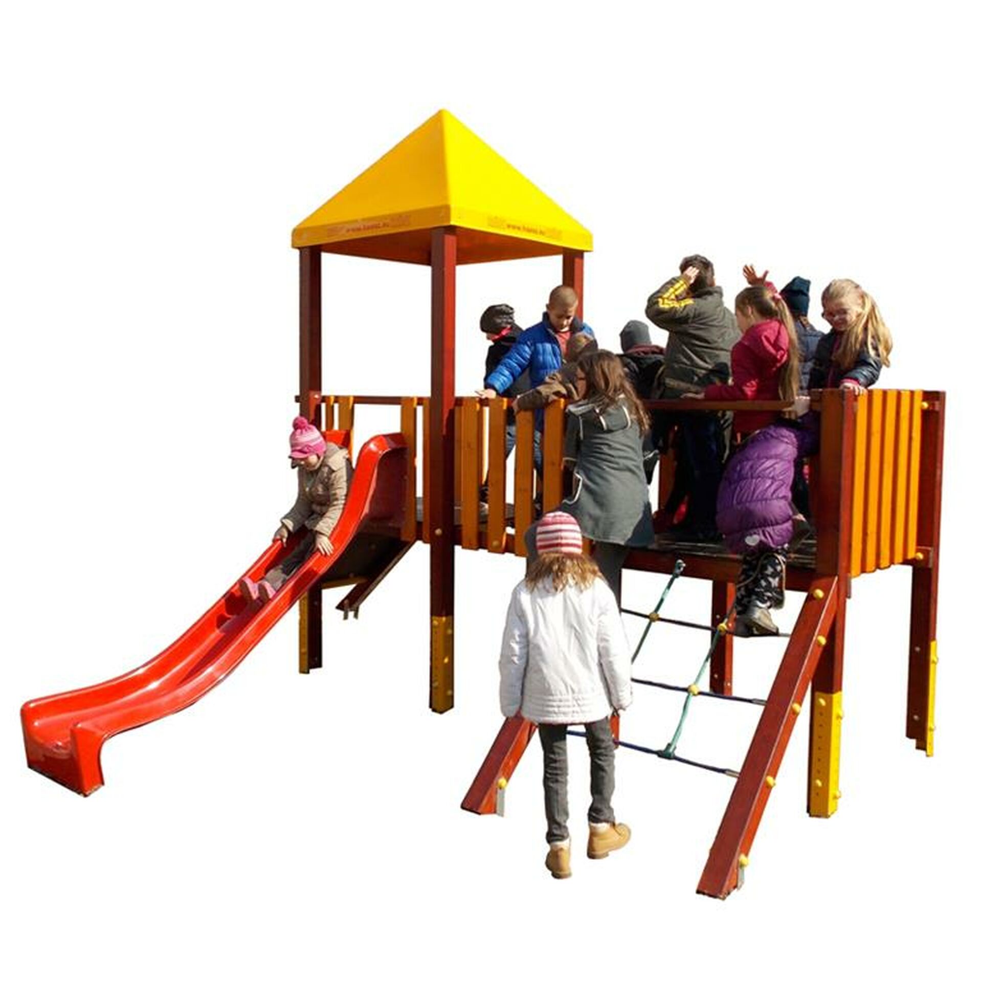 Mászóvár II.Termékkód: H-1222A játékvár egy fedett és egy nyitott toronyrészből áll. A tetővel fedett tornyot egy poliészter beülőkaros csúszdalappal és egy, különböző méretű mászókövekkel ellátott mászófallal láttuk el. A mászóvár különlegessége, hogy a két tornyot acélbetétes kötélből készült híd köti össze. A nyitott toronyrészt egy 16 mm-es vastagságú acélbetétes kötélből készült mászóhálón lehet meghódítani.A termék megfelel az MSZ EN 1176-1:2018, MSZ EN 1176-2:2017 AC és MSZ EN 1176-3:2018 szabványpontoknak és TÜV Rheinland által kibocsátott játszótéri megfelelőségi tanúsítvánnyal rendelkezik.A játszótéri szabványnak megfelelően az esési térben ütéscsillapító felület kialakítása nem szükséges az alacsony esésmagasság miatt (füvesítés elégséges)