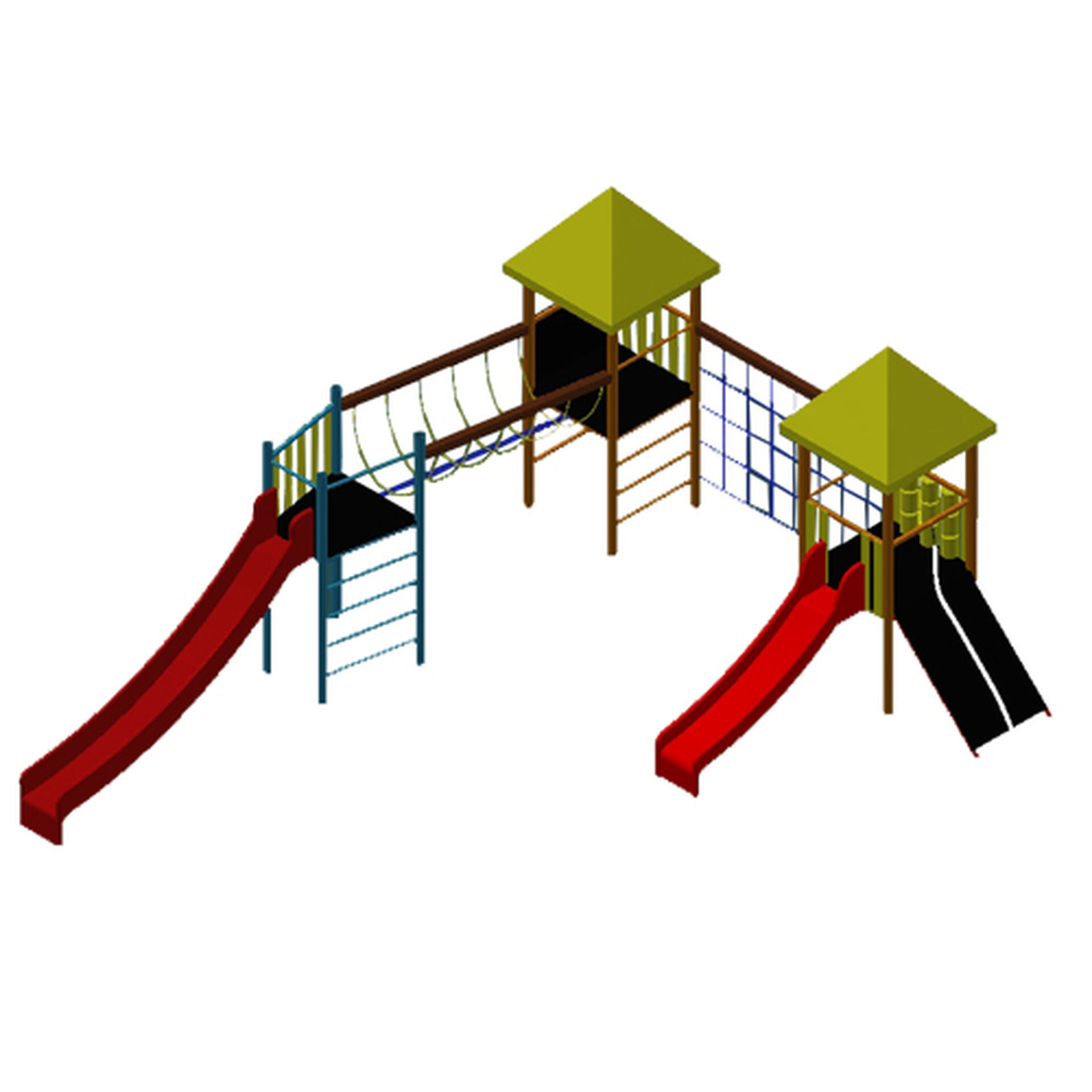 Vénusz M játszóvárA három torony dobogómagassága 100 cm, 120 cm illetve 150 cm. A kisebbeknek való torony 1 méter dobogómagasságú, amely tartalmaz egy 1 méter indulómagasságú beülő karos poliészter csúszdát, egy ferde rámpát ahol kötél segíti a felmászást, szemben lévő oldalon pedig egy függőleges létrán lehet feljutni ebbe a toronyba. Ennek a toronynak a csúszdával szemközti oldalán egy kilenc hengerből álló OXO amőba játékot helyeztünk el.Ezt a tornyot egy nagy függőleges kötélháló köti össze a nagyobbaknak szánt mászó toronnyal, ahová át lehet mászni a függőleges kötélhálón is, illetve fel lehet jutni egy függőleges sziklakövekkel ellátott mászó falon is, illetve függőleges fém létrán is. Ennek a toronynak a dobogómagassága 120 cm. Ebből a toronyból egy kötélhídon lehet átjutni a 150 cm dobogómagasságú nagy csúszdatoronyba, ahonnan egy 150 cm indulómagasságú beülő karos poliészter csúszdán lehet lecsúszni. Ebbe a csúszdatoronyba való közvetlen feljutást egy függőleges fém létra is biztosítja a csúszdázó gyerekeknek.Felhasznált anyagok, szerkezeti felépítés: